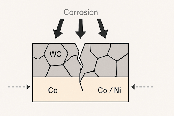 Cobalt-bonded carbides (WC-Co): Susceptible to corrosion, especially in acidic or chloride-rich environments.