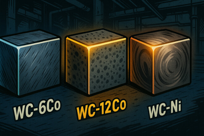 | Abrasive wear | Sand and solids grinding surface | Use WC-6Co or submicron WC grades |