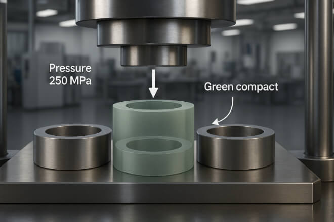Once the powder is prepared, it is pressed into a ring-shaped compact using CNC-controlled dies or cold isostatic presses (CIP).