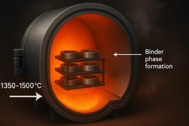 This transforms the weak green ring into a hard, dense carbide blank with compressive strength exceeding 4000 MPa.
