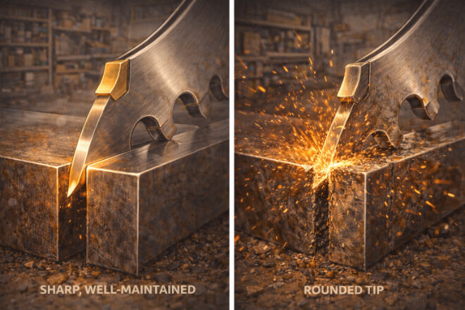 The geometry of the tip influences the blade’s wear resistance and how quickly the carbide material degrades under continuous use.