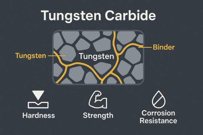 Tungsten carbide (WC) is a compound of tungsten and carbon, usually bonded with a small amount of nickel or cobalt. This creates an extremely hard and chemically stable material.
