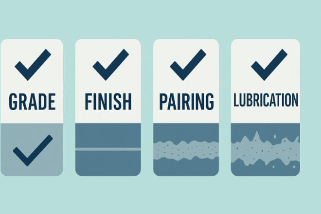 Proper material pairing minimizes adhesive wear and avoids galling or metal transfer between surfaces.