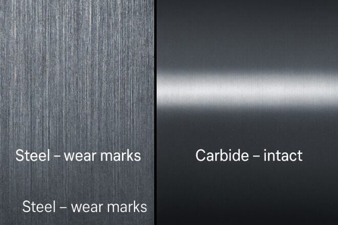 Where steel or bronze bushings deform, tungsten carbide stays stable.