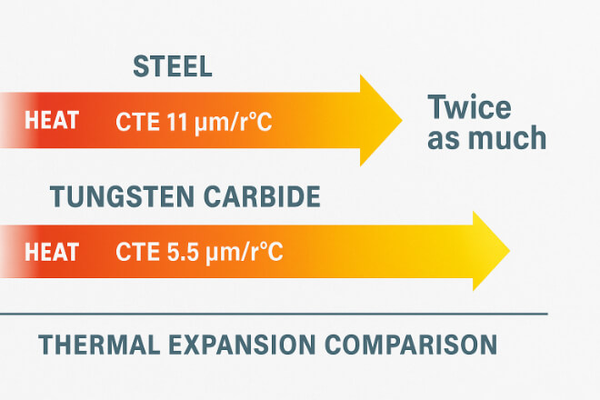 Tungsten carbide expands very little under heat — with a thermal expansion coefficient about half that of steel.