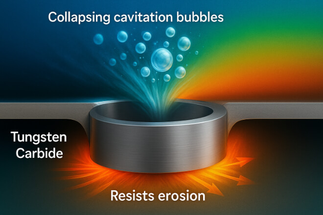Tungsten carbide resists both chemical attack and erosive pitting, especially when nickel binders are used.