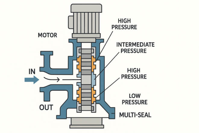 Seal stacks use multiple mechanical seals arranged in series. The lower seal typically contacts the sand-laden water, while the upper seals protect the motor oil chamber.