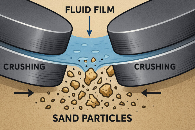 When sand particles enter the sealing gap, the hard carbide faces crush or roll the particles instead of letting them embed.