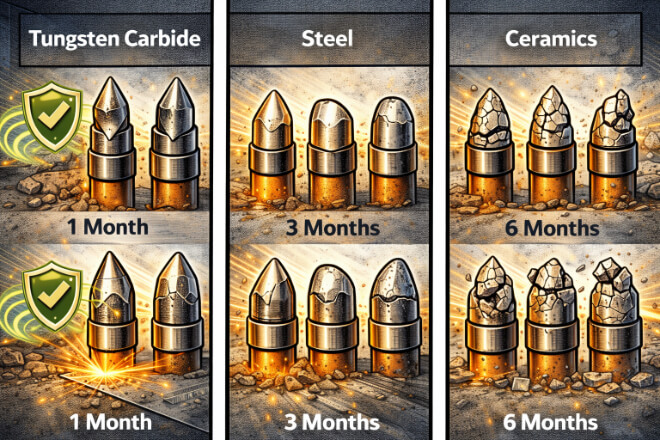 Steel and ceramics are often considered alternatives to tungsten carbide, and each material has its strengths and weaknesses.