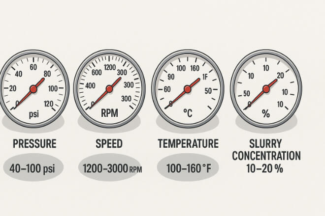 Surface scratches | Contaminated slurry or pads | Use clean abrasives and pads |