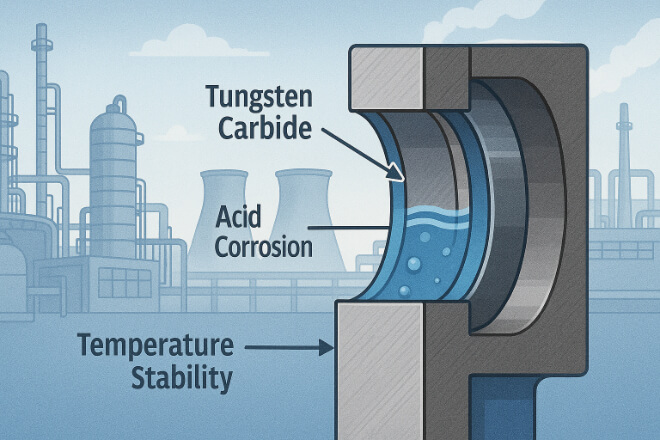 Special grades of tungsten carbide with nickel binders or silicon carbide can resist corrosion from acids, alkalis, and aggressive fluids — reducing chemical damage and downtime caused by seal leakage.