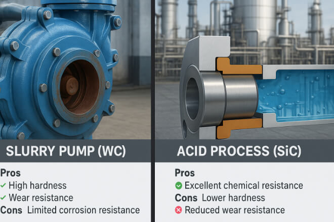 | Application Condition | Recommended Material | Abrasive or particle-laden fluids | Cacbua Vonfram | Highly corrosive fluids | Cacbua silic | High pressure or load | Cacbua Vonfram | Thermal cycling or temperature shock | Tungsten Carbide (Ni binder) | Light chemical or clean water service | Either |