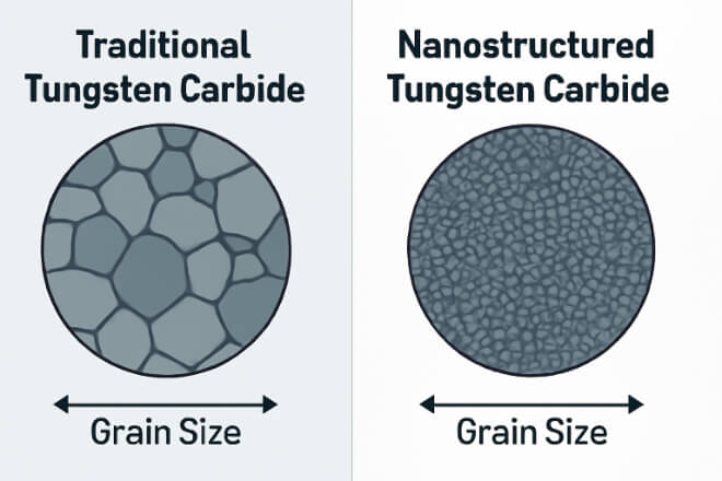 Nanostructured tungsten carbide has much smaller grains than traditional tungsten carbide, which allows for a denser structure.