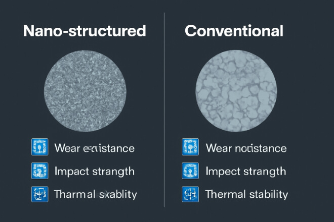 As the table shows, nanostructured tungsten carbide offers superior độ cứng Và khả năng chống mài mòn, particularly in harsh operating conditions where abrasion, impact, and extreme temperatures are common.