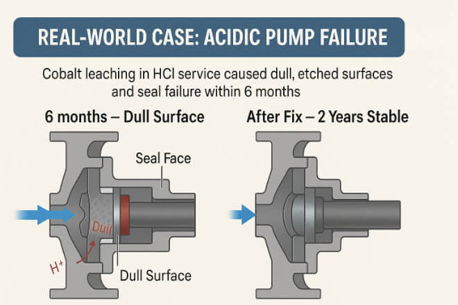 In refinery pumps running at 180°C, cobalt leaching is often observed near the hottest contact zones, especially when flush flow is restricted.
