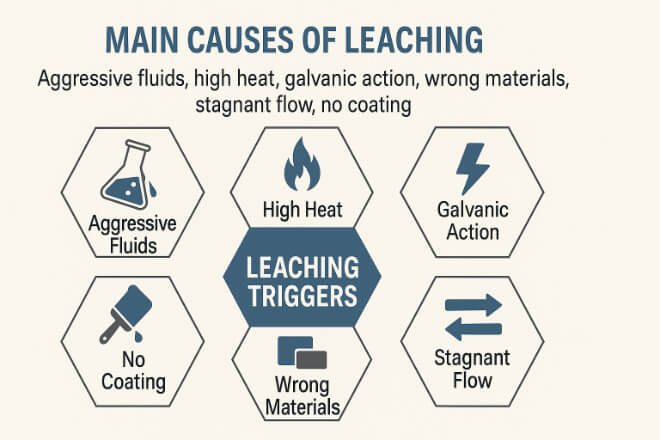 Leaching is not caused by friction like normal wear. It is chemical corrosion, often accelerated by temperature, fluid chemistry, and electrochemical effects.