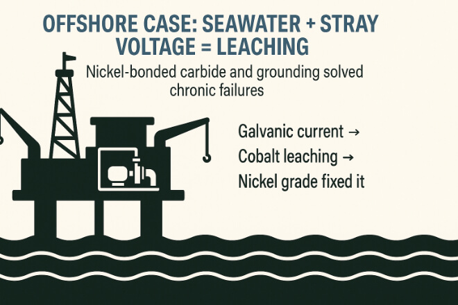 The seawater service, combined with occasional voltage potential between pump casing and motor frame, created electrochemical leaching of the cobalt binder.