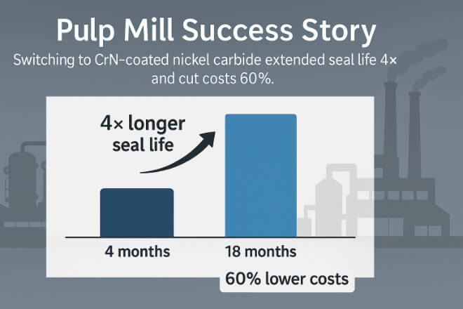 By changing to nickel-bonded tungsten carbide with a CrN coating, and improving the seal flush with a clean water loop, seal life was extended to 18 months.