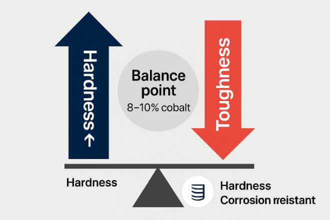 • High cobalt (10–15%) better shock absorption but less resistant to abrasion.
