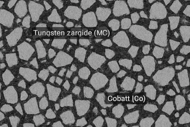 Tungsten Carbide (WC) grains – extremely hard ceramic crystals.